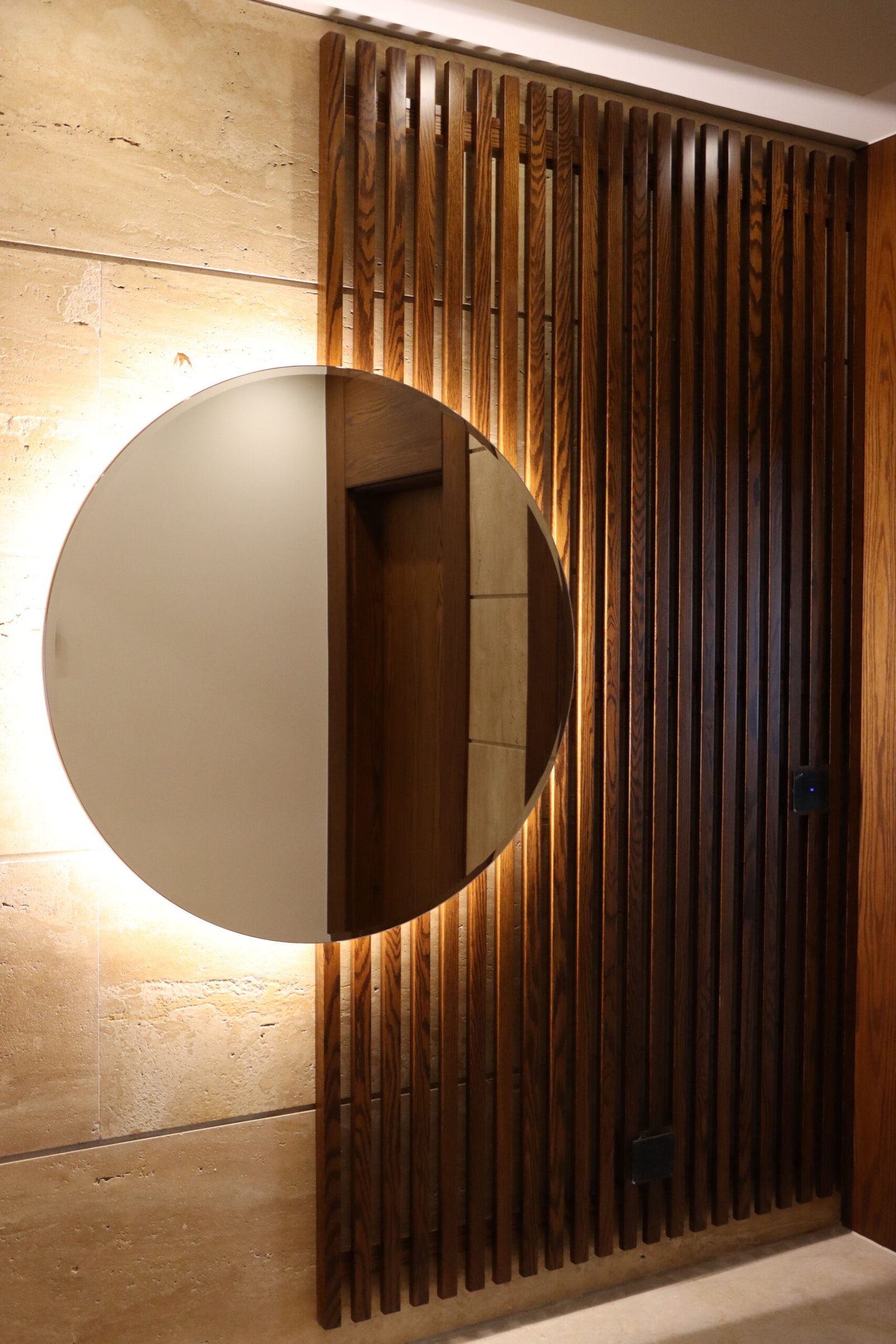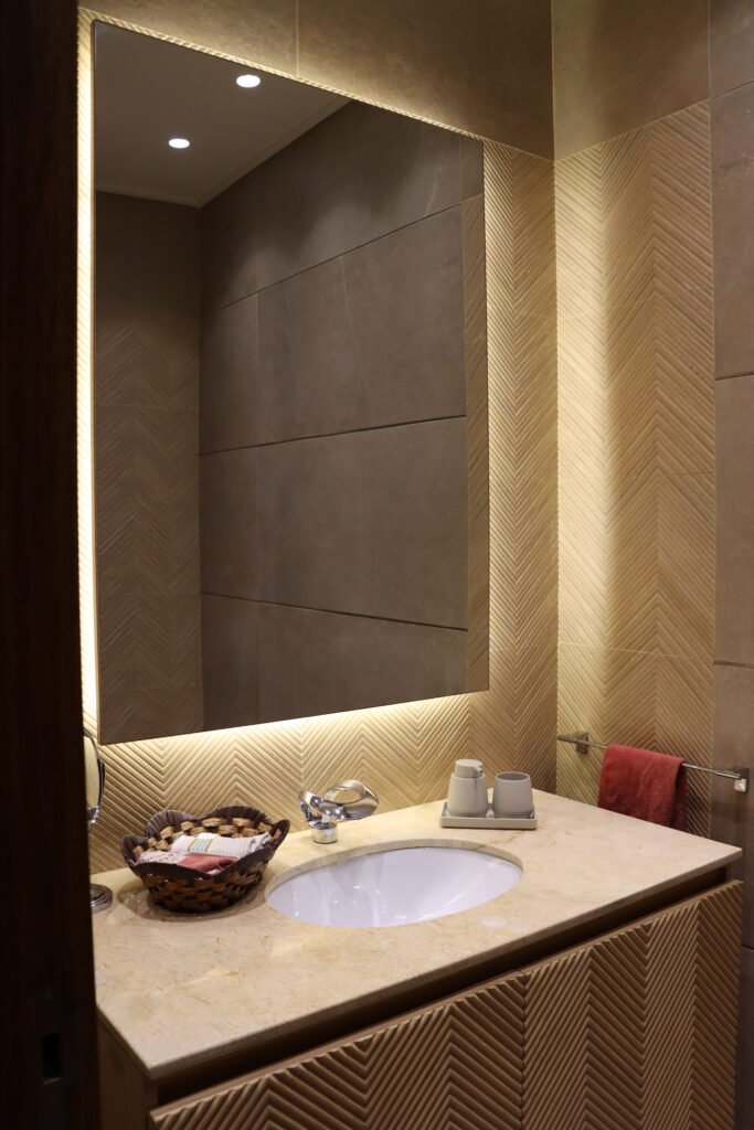 A refined bathroom setup featuring a custom wood-textured vanity with chevron detailing, topped with smooth natural stone. The backlit mirror and recessed lighting enhance the contemporary feel, making this space both functional and luxurious — a perfect example of modern craftsmanship by TEAK.