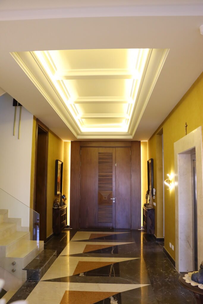 A statement entryway crafted with rich wood paneling and geometric marble flooring. The illuminated recessed ceiling adds depth and sophistication, perfectly balancing traditional elegance with modern detail. This custom design reflects both luxury and architectural precision — a hallmark of TEAK’s craftsmanship.